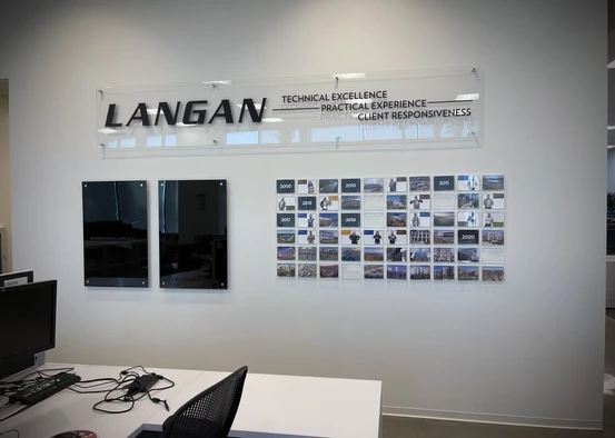 Side view of mixed media dimensional wall graphic made from adhesive vinyl, PVC panels and a acrylic plaque.