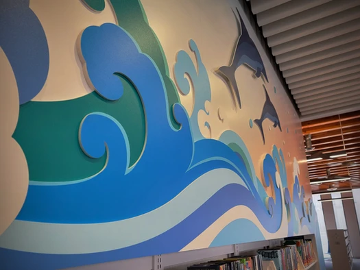 Close up side view of mixed media dimensional wall graphic made from adhesive vinyl, PVC panels and a acrylic plaque.